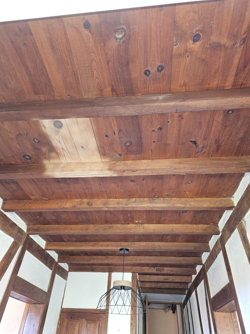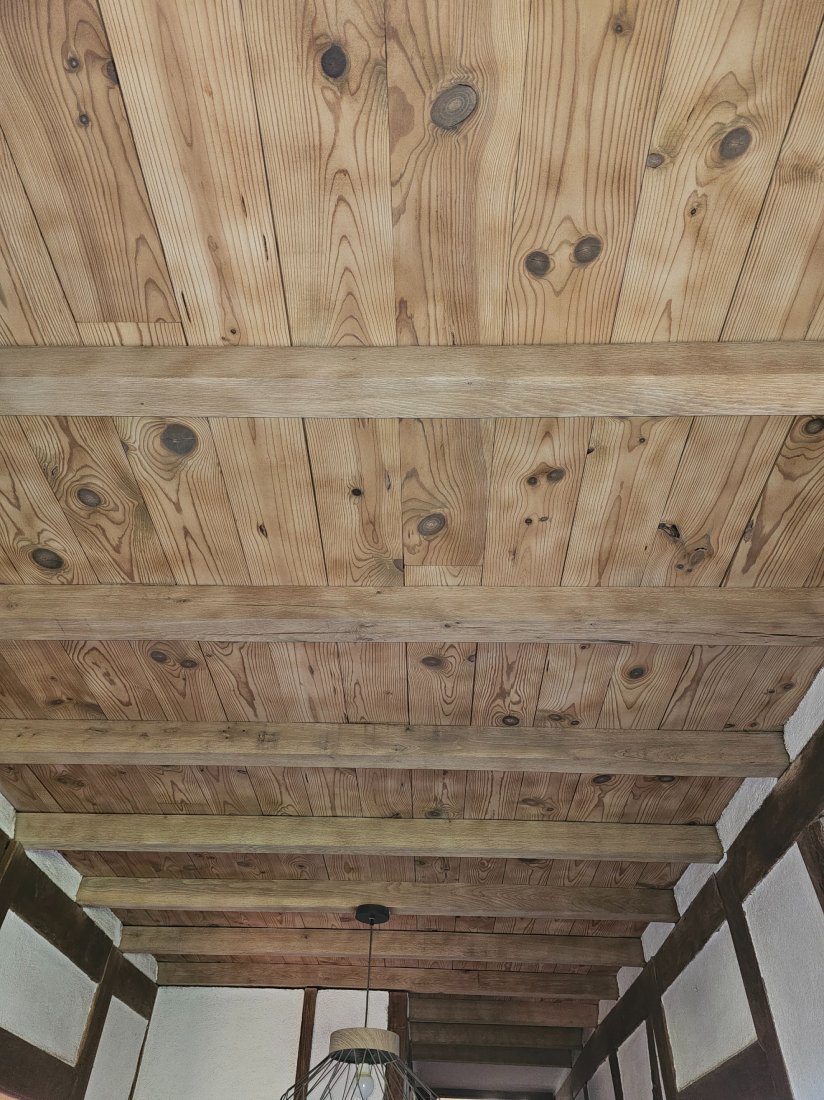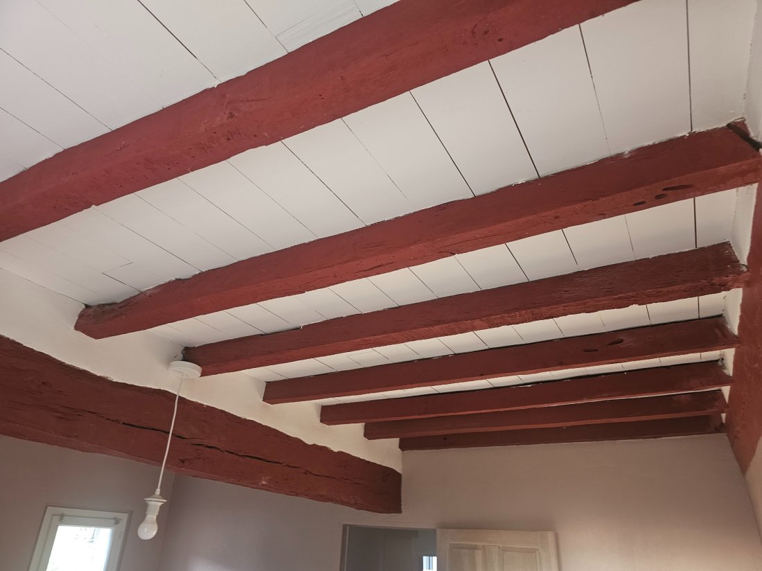 Aérogommage de plusieurs plafonds en bois recouverts de peintures dans une ferme du Gers, réalisé par 3D Occitanie : décapage précis et respectueux du support pour retrouver l’aspect naturel du bois.