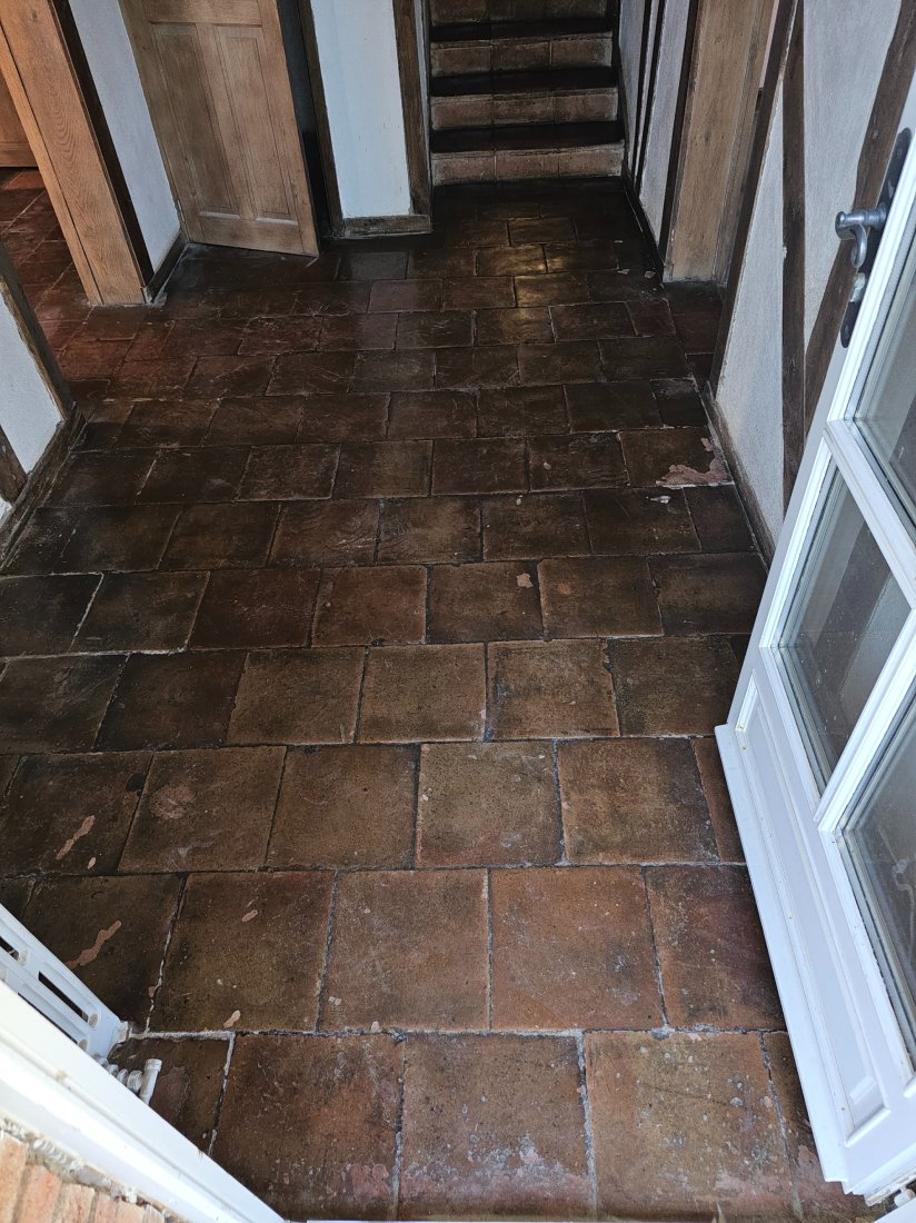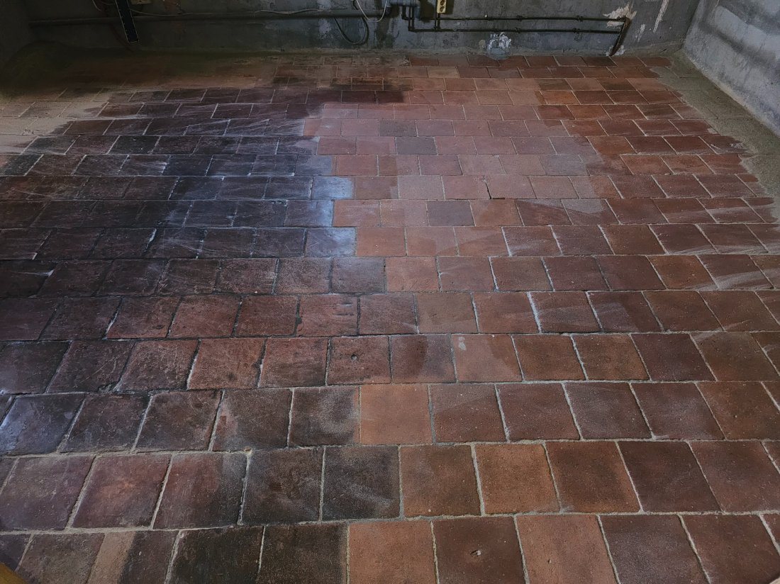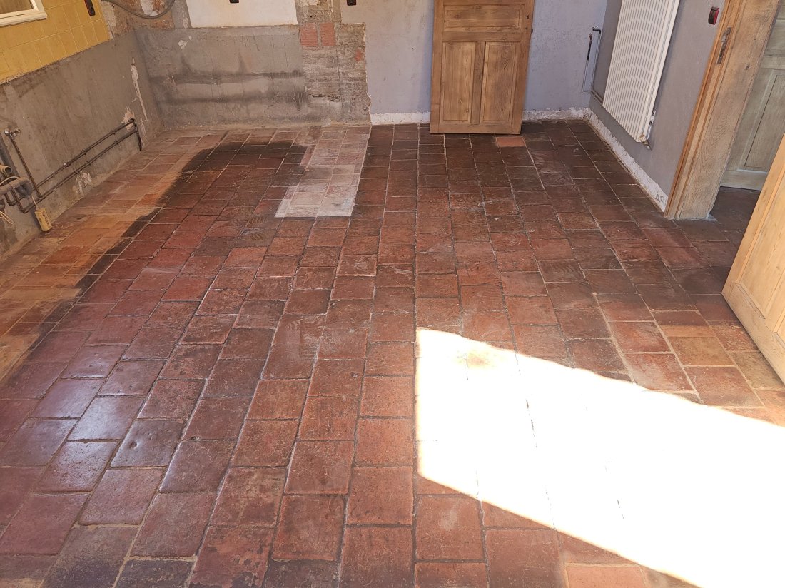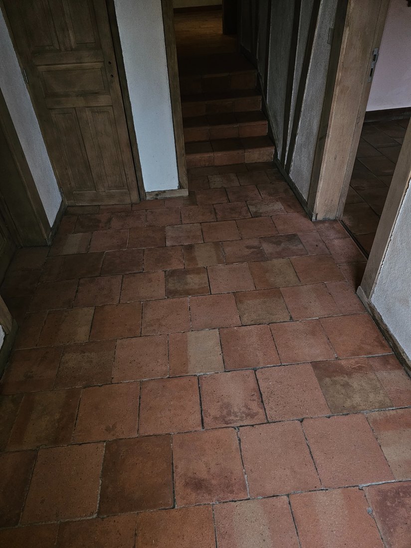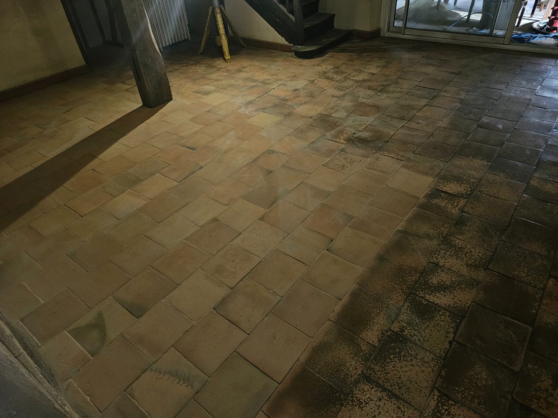 Aérogommage délicat d’un sol en tomettes anciennes dans une ferme gersoise du XVIIe siècle : nettoyage précis, respect du patrimoine et restauration de l’authenticité des matériaux par 3D Occitanie.