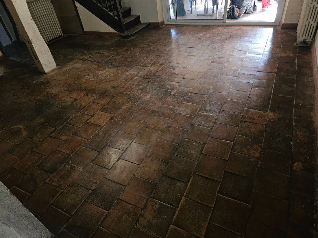 La principale problématique de ce chantier réside dans la nécessité de nettoyer en profondeur sans abîmer les tomettes anciennes. Les méthodes de décapage classiques, souvent trop agressives, risquent d’endommager la surface poreuse et fragile des carreaux. L’aérogommage, technique douce de sablage à basse pression, s’impose ici comme la solution idéale pour retirer les impuretés et redonner de l’éclat, tout en préservant l’intégrité des matériaux. Notre savoir-faire nous permet d’ajuster la pression et le type d’abrasif utilisé, afin de garantir un résultat optimal, respectueux de la structure et de la patine du sol ancien.