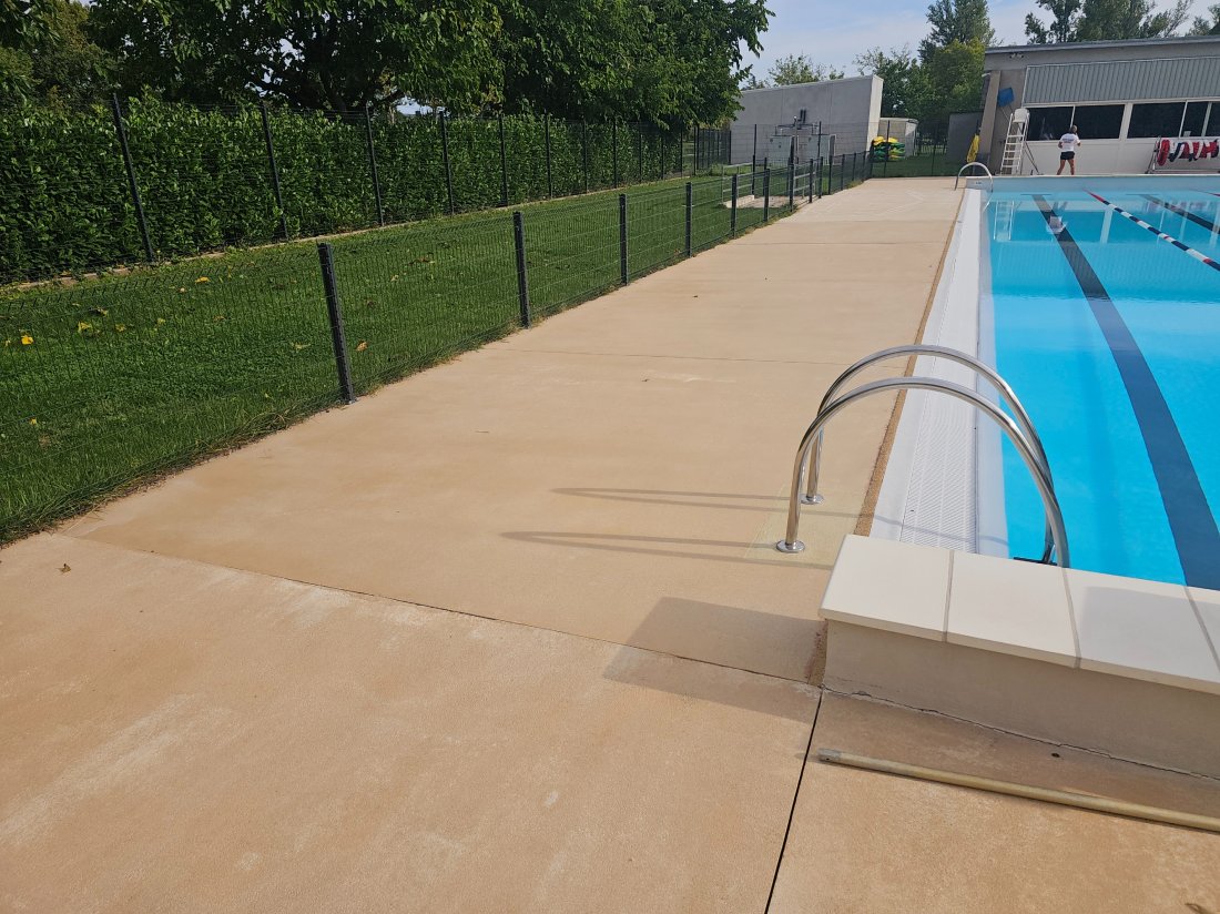 Création de zones antidérapantes en sortie de bassin par 3D Occitanie à la piscine municipale de Haute-Garonne : sécurité renforcée et finition soignée grâce à notre expertise en décapage et sablage.